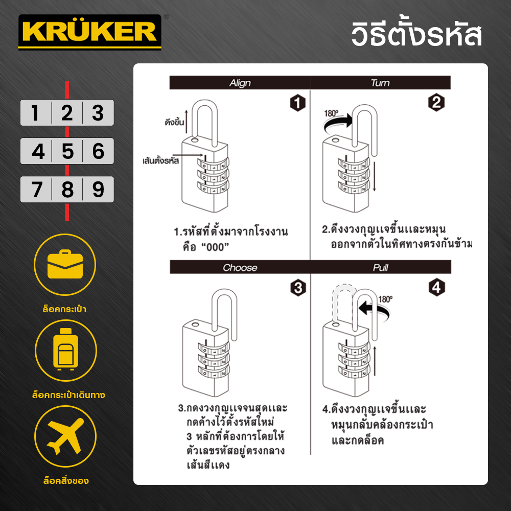1. ตัวล็อคตั้งค่าเริ่มต้นจากโรงงานคือ 0-0-0 คุณสามารถใช้ตัวเลขชุดนี้ในการล็อคได้ หรือจะตั้งรหัสใหม่ก็ได้เช่นกัน
